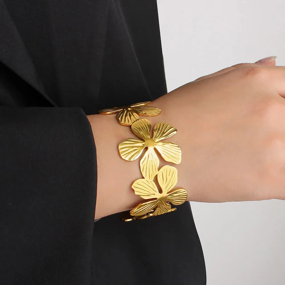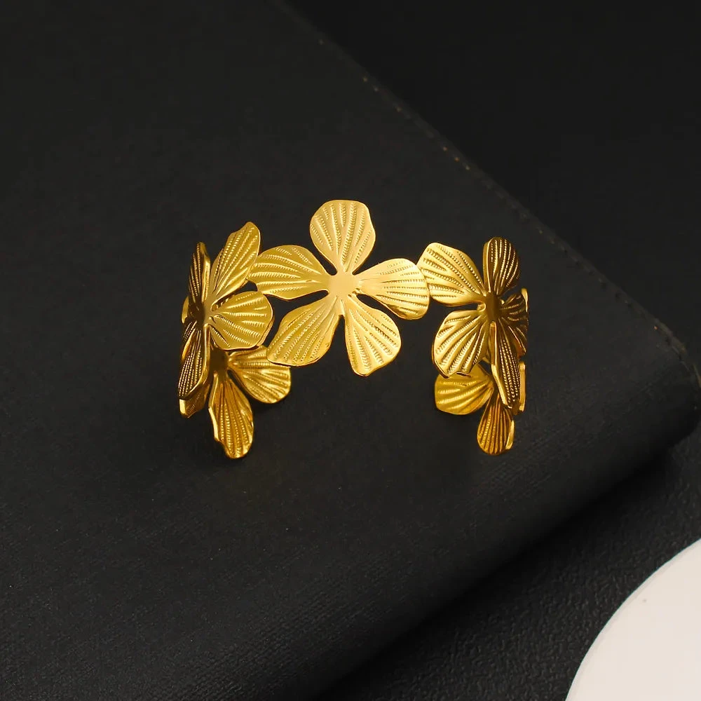 Βραχιόλι επιχρυσωμένο ατσάλι φαρδύ με λουλούδια-BR019