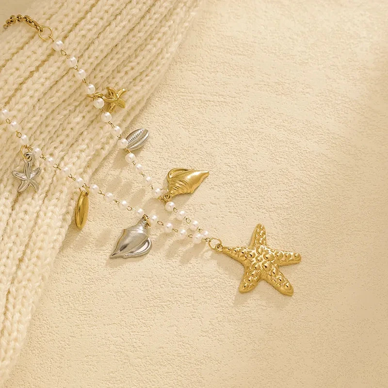 Κολιέ επιχρυσωμένο ατσάλι με ασημί και χρυσά κοχύλια και πέρλες-NE366