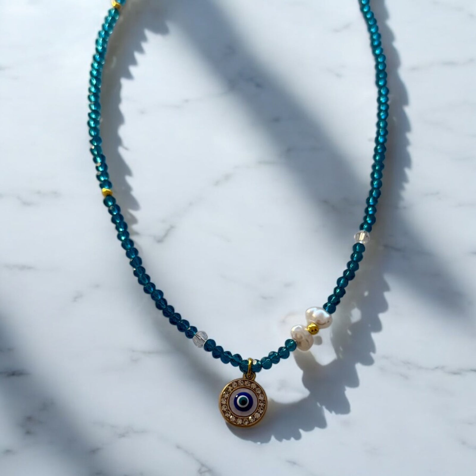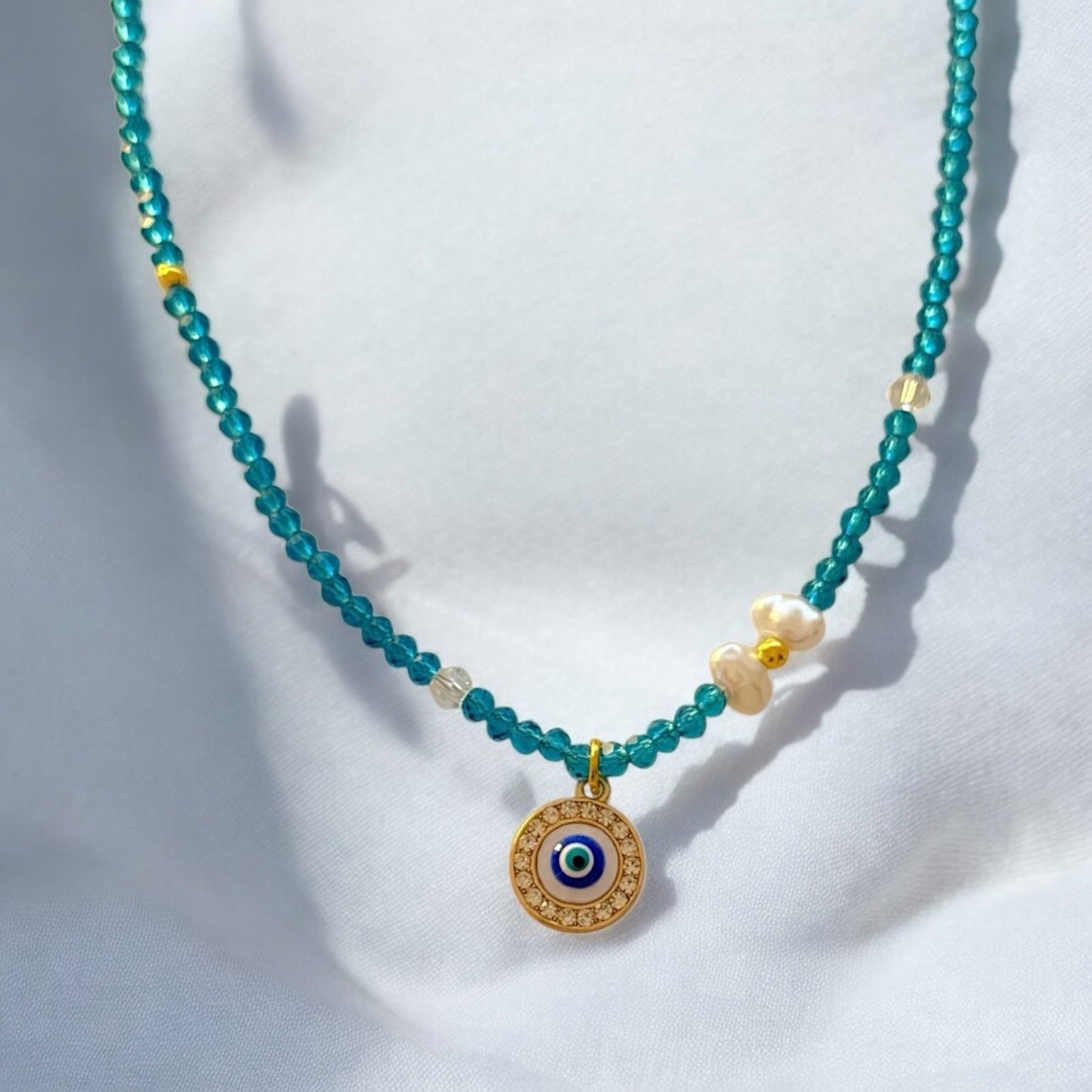 Κολιέ με γαλάζιες χάντρες και κρεμαστό ματάκι – NE429