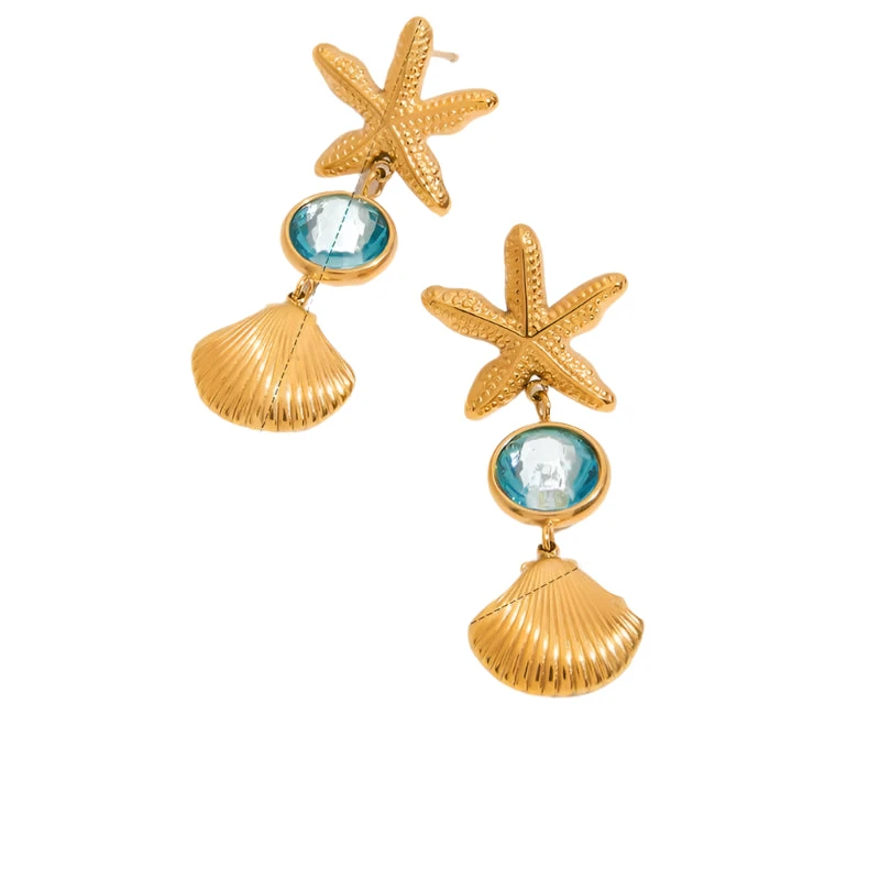 Σκουλαρίκια χρυσό ατσάλι με αστερία κοχύλια και γαλάζια πέτρα-EA498
